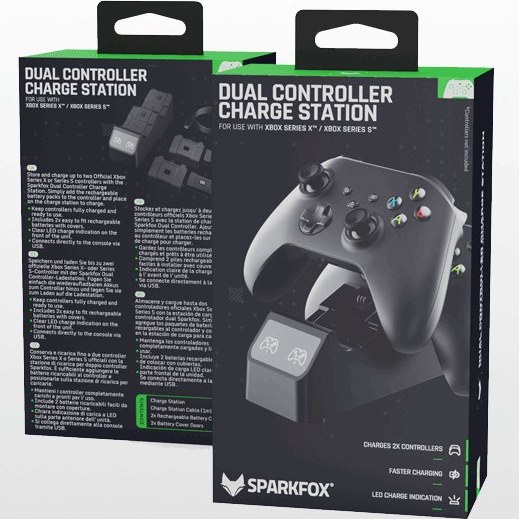 پایه شارژر دوگانه SparkFox مخصوص کنترلرهای جدید ایکس باکس که برای ایکس باکس سری ایکس و ایکس باکس سری اس عرضه شده‌اند، این امکان را به شما می‌دهد تا دو عدد از این کنترلرها را به صورت همزمان شارژ کنید. این پایه شارژر دارای چراغ LED برای نمایش وضعیت شارژ است و پس از پایان شارژ، جریان برق را قطع می‌کند. همچنین این محصول دارای دو عدد باتری قابل شارژ به همراه درپوش این باتری‌ها است که می‌توانید آن‌ها را جایگزین باتری قلمی کنید. این محصول دارای کف ضد لغزش و با خیال راحت می‌توانید آن را روی هر سطحی قرار دهید. این پایه شارژر فقط با مدل‌های جدید کنترلر ایکس باکس سازگار است.