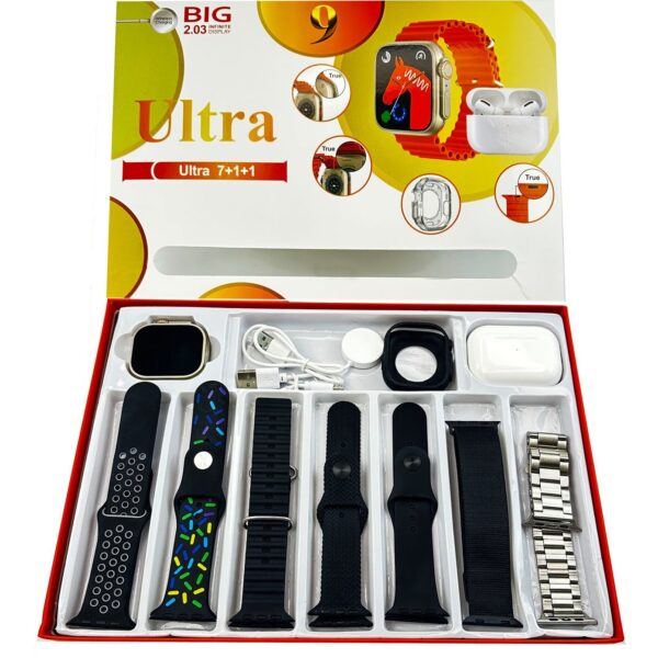 پک هدیه ساعت و ایرپاد 7+1+1 این مدل ساعت در واقع یک پک کامل اقتصادی برای استفاده کاربران عزیز است یک عدد ایرپاد و 7 عدد بند اپلی در طرح ها و رنگهای مختلف است .